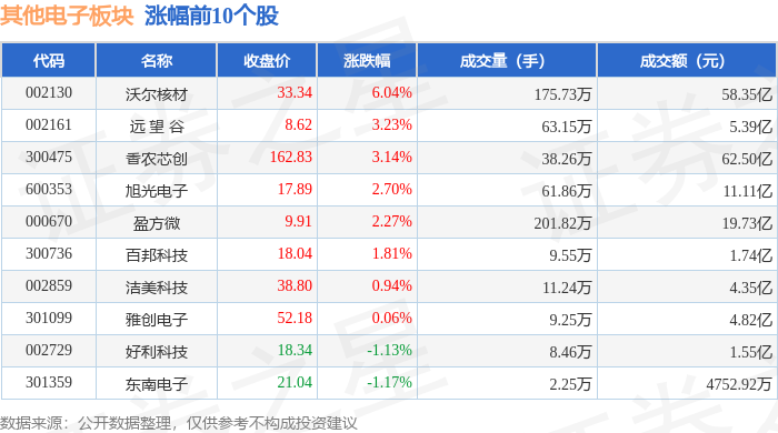 证券之星消息,1月26日其他电子板块较上一交易日下跌0.44%,久之洋领跌。当日上证指数报收于 4132.61,下跌0.09%。深证成指报收于14316.64,下跌0.85%。其他电子板块个股涨跌见下表: | 代码 | 名称 | 收盘价 | 涨跌幅 | 成交量(手) | 成交额(元) | | | --- | --- | --- | --- | --- | --- | --- | | 002130 | 沃尔核材 | 33.34 | 6.04% | 175.73万 | | 58.35 Z | | 002161 | 远望谷 | 8.62 | 3.23% | 63.15万 | | 5.39 乙 | | 300475 | 香农芯创 | 162.83 | 3.14% | 38.26万 | | 62.50亿 | | 600353 | 旭光电子 | 17.89 | 2.70% | 61.86万 | | 11.11亿 | | 000670 | 盈方微 | 16.6 | 2.27% | 201.82万 | | 19.73亿 | | 300736 | 百邦科技 | 18.04 | 1.81% | 9.55万 | | 1.74亿 | ...
