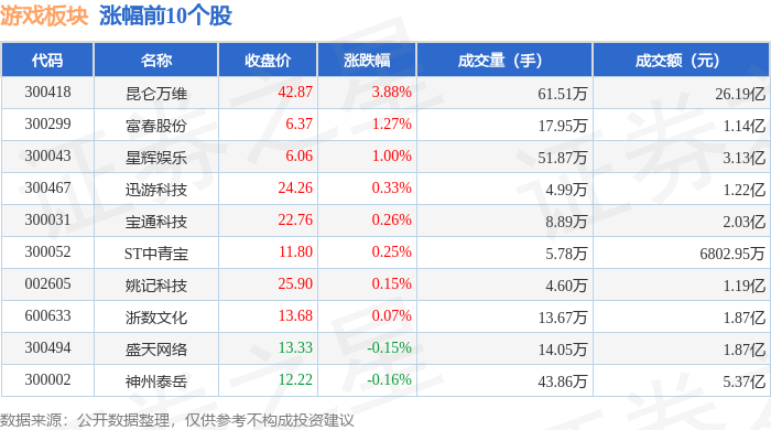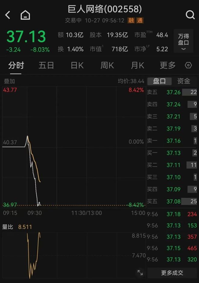 游族网络跌近6%,恺英网络、完美世界、三七互娱、冰川网络集体走弱。 编辑|钉钉 10月27日盘初,游戏股集体跳水,巨人网络闪崩跌超8%,股价现报37.13元,成交额超10亿元。 | 游族网络 | 12.69 | -5.86% | | --- | --- | --- | | 002174.SZ | | | | 恺英网络 | 23.66 | -5.40% | | 002517.SZ | | | | ST华通 | 18.79 | -4.91% | | 002602.SZ | | | | *ST大晟 | 4.13 | -4.18% | | 600892.SH | | | | 完美世界 | 16.82 | -2.77% | | 002624.SZ | | | | 冰川网络 | 39.33 | -2.55% | | 300533.SZ | | | | 国脉文化 | 14.42 | -2.44% | | 600640.SH | | | | 三七互娱 | 19.99 | -2.11% | | 002555.SZ | | | ...