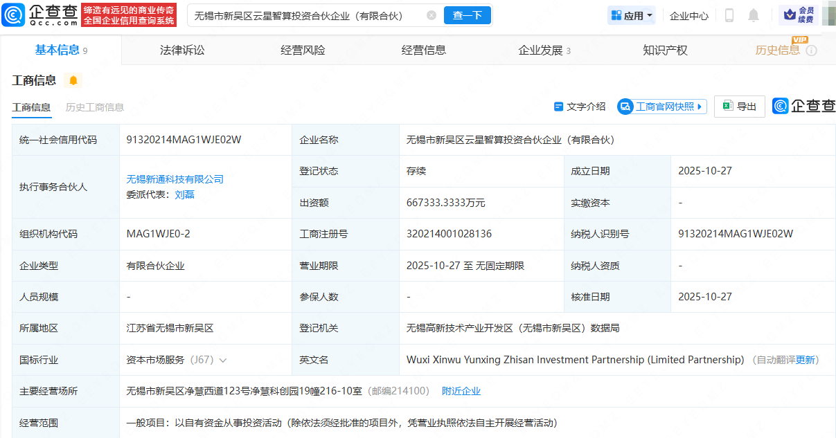 企查查APP显示,近日,无锡市新吴区云星智算投资合伙企业(有限合伙)成立,出资额约66.7亿人民币,经营范围为以自有资金从事投资活动。企查查股 权穿透显示,该合伙企业由无锡新通科技有限公司、游族网络(002174)旗下上海游族互娱网络科技有限公司、上海驰游信息技术有限公司等共同出资。 | 全国企业信用查询系 | | 无锡市新吴区云星智算投资合伙企业(有限合伙) | × | 音一下 | | | 0 | ー 応用 ▼ | 个//中心 | | | | --- | --- | --- | --- | --- | --- | --- | --- | --- | --- | --- | --- | | 基本信息 9 | 法律诉讼 | 经营风险 | 经营信息 | | | 企业发展 3 | 1 | 知识产权 | | | | | 工商信息 ● | | | | | | | | | | | | | 工商信省 | | | | | 历史工商信息 | 目 文字介绍 | 제 금융 | La 工商官网快照▶ | | | | | 统一社会信用代码 | 91320214MAG1WJE02W | 企业名称 | | | | | | | | 无锡市新 ...