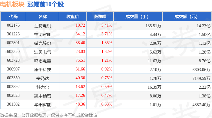 | 代码 | 名称 | 收盘价 | 涨跌幅 | 成交量(手) | 成交额(元) | | --- | --- | --- | --- | --- | --- | | 002176 | 江特电机 | 10.36 | -2.72% | 97.23万 | 2666.6 | | 920100 | 三协电机 | 66.98 | -1.64% | 1.52万 | 1.00亿 | | 002249 | 大洋电机 | 10.98 | -1.61% | 104.73万 | 11.40亿 | | 002823 | 凯中精密 | 16.59 | -1.48% | ● 9.57万 | 1.57亿 | | 603320 | 迪贝电气 | 22.34 | -1.41% | 4.93万 | 1.09亿 | | 603344 | 星德胜 | 32.83 | -1.41% | 2.80万 | 9186.39万 | | 002196 | 方正电机 | 17.39 | -1.25% | 94.59万 | 16.53亿 | | 002576 | 通达动力 | 18.08 | -1.04% | 4.95万 | 8848.45万 | | 603350 | ...