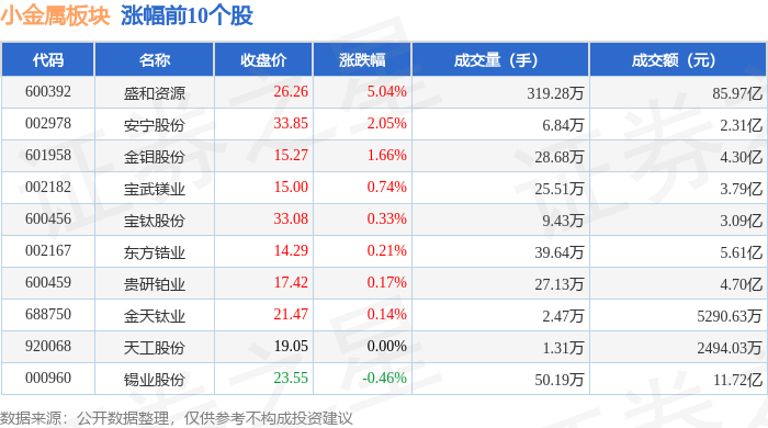 Market Overview - The small metal sector experienced a decline of 1.67% on October 15, with Northern Rare Earth leading the drop [1] - The Shanghai Composite Index closed at 3912.21, up 1.22%, while the Shenzhen Component Index closed at 13118.75, up 1.73% [1] Individual Stock Performance - Shenghe Resources (600392) saw a closing price of 26.26, with an increase of 5.04% and a trading volume of 3.19 million shares, amounting to a transaction value of 8.597 billion [1] - Anning Co. (002978) closed at 33.85, up 2.05%, with a trading volume of 68,400 shares and a transaction value of 231 million [1] - Northern Rare Earth (600111) closed at 54.50, down 4.05%, with a trading volume of 3.03 million shares and a transaction value of 1.6617 billion [2] Capital Flow Analysis - The small metal sector experienced a net outflow of 2.092 billion from main funds, while retail investors saw a net inflow of 2.265 billion [2] - The main funds showed a significant outflow in several stocks, including Baotai Co. (600456) with a net outflow of 27.17 million [3] - Retail investors contributed positively to stocks like Shenghe Resources (600392) with a net inflow of 65.96 million [3]