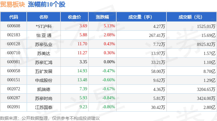 证券之星消息,1月27日贸易板块较上一交易日下跌0.24%,东方创业领跌。当日上证指数报收于 4139.9,上涨0.18%。深证成指报收于14329.91,上涨0.09%。贸易板块个股涨跌见下表: | 代码 | 名称 | 收盘价 | 涨跌幅 | 成交量(手) | 成交额(元) | | | --- | --- | --- | --- | --- | --- | --- | | 600608 | *ST PA | 3.69 | 5.13% | 4.27万 | 1525.01万 | | | 002183 | 怡亚通 | 5.88 | 2.08% | 267.41万 | | 15.69 Z | | 600128 | 苏蒙弘业 | 11.70 | 0.43% | 7.72万 | 8925.82万 | | | 600710 | 苏美达 | 11.27 | 0.36% | 13.97万 | | 1.57亿 | | 600981 | 示索汇鸿 | 3.35 | 0.00% | 33.21万 | | 1.10亿 | | 600058 | 五矿发展 | 14.93 | -0.47% | 58.00万 | | 8.70亿 | | ...