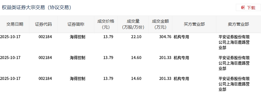 | 交易日期 | 证券代码 | 证券简称 | 成交价格 | 成交量 | 成交全额 买方营业部 | 卖方营业部 | | --- | --- | --- | --- | --- | --- | --- | | | | | (元) | (万股/万份) | (万元) | | | 2025-10-20 | 002184 | 海得控制 | 13.72 | 40.00 | 548.80 招商证券股份有限 | 平安证券股份有限 | | | | | | | 公司西安北大街证 | 公司上海巨鹿路营 | | | | | | | 券营业部 | 485万 | | 2025-10-20 | 002184 | 海得控制 | 13.72 | 14.60 | 200.31 机构专用 | 平安证券股份有限 | | | | | | | | 公司上海巨鹿路营 | | | | | | | | 业部 | | 2025-10-20 | 002184 | 海得控制 | 13.72 | 14.60 | 200.31 机构专用 | 平安证券股份有限 | | | | | | | | 公司上海巨鹿路营 | | | | | | | | 4637 | | 2025-1 ...