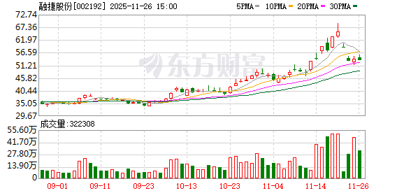 11月26日,融捷股份盘中上涨2.06%,截至11:27,报55.04元/股,成交11.64亿元,换手率8.31%,总市 值142.91亿元。 融捷股份所属申万行业为:有色金属-能源金属-锂。所属概念板块包括:龙虎榜热门、锂电池、磷酸铁 锂、小金属、稀缺资源等。 截至10月31日,融捷股份股东户数5.20万,较上期增加3.15%;人均流通股4983股,较上期减少3.05%。 2025年1月-9月,融捷股份实现营业收入5.10亿元,同比增长26.21%;归母净利润1.44亿元,同比减少 21.22%。 融捷股份今年以来股价涨73.44%,近5个交易日跌12.99%,近20日涨17.68%,近60日涨54.52%。 今年以来融捷股份已经2次登上龙虎榜,最近一次登上龙虎榜为11月19日,当日龙虎榜净买入2.24亿 元;买入总计7.52亿元 ,占总成交额比23.69%;卖出总计5.27亿元 ,占总成交额比16.62%。 资料显示,融捷股份有限公司位于广东省广州市天河区珠江西路5号广州国际金融中心45层04-05单元, 成立日期1998年8月21日,上市日期2007年12月5日,公司主营业务涉及以新能源锂电材料产业链为 ...