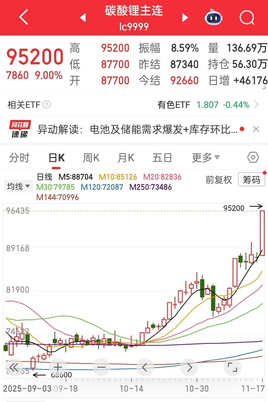 Group 1 - The core viewpoint of the news is that lithium carbonate futures have surged, reaching a new high since July 2024, driven by strong demand and supply dynamics in the market [2][4][6] - As of November 17, the main contract for lithium carbonate closed at 95,200 yuan/ton, marking a nearly 30% increase since mid-October [2][4] - The strong performance in lithium carbonate prices has led to significant gains in related sectors, particularly energy metals and battery manufacturers, with companies like Shengxin Lithium Energy and Rongjie Co. hitting the daily limit up [2][4] Group 2 - Supply dynamics show a trend of "domestic production increase and import contraction," with September imports down by 10.3% and exports down by 59.12% [4][5] - Domestic lithium carbonate production in October was 51,530 tons, a 9.31% increase month-on-month, but the operating rate was only 43%, indicating constraints in capacity release [4][5] - Demand is being driven by a significant increase in the production and sales of new energy vehicles, with October production reaching 1.772 million units, a 9.59% month-on-month increase [4][5] Group 3 - Inventory levels are decreasing, with October lithium carbonate monthly inventory at 84,234 tons and a weekly inventory of 120,472 tons, indicating a trend of supply-demand improvement [5] - Analysts suggest that while short-term demand is strong, there are concerns about potential supply pressures in the long term due to high operating rates and new capacities coming online [5][6] - Predictions indicate that if demand growth exceeds 30% next year, prices could potentially break through 150,000 yuan/ton, with a possibility of reaching 200,000 yuan/ton if supply cannot keep pace [6]