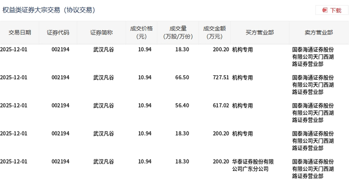 | 交易日期 | 证券代码 | 证券简称 | 成交价格 | 成交量 | 成交金额 | 买方营业部 | 卖方营业部 | | --- | --- | --- | --- | --- | --- | --- | --- | | | | | (元) | (万股/万份) | (万元) | | | | 2025-12-10 | 002194 | 武汉凡谷 | 11.36 | 49.60 | 563.46 机构专用 | | 国泰海通证券股份 | | | | | | | | | 有限公司武汉赵家 | | | | | | | | | 条证券营业部 | | 2025-12-10 | 002194 | 武汉凡谷 | 11.36 | 17.70 | 201.07 机构专用 | | 国泰海通证券股份 | | | | | | | | | 有限公司面议赵家 | | | | | | | | | 条证券营业部 | | 2025-12-10 | 002194 | 武汉凡谷 | 11.36 | 17.70 | 201.07 机构专用 | | 国泰海通证券股份 | | | | | | | | | 有限公司武汉赵家 | | | | | | | | | ...