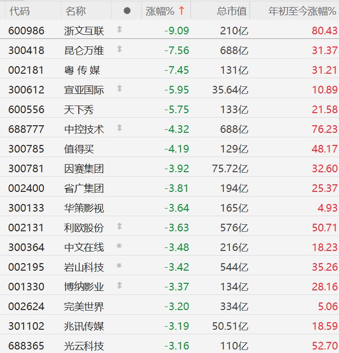 责任编辑:栎树 | 代码 | 名称 | | 涨幅% ↑ | 总市值 | 年初至今涨幅% | | --- | --- | --- | --- | --- | --- | | 600986 | 浙文互联 | 1 | -9.09 | 210亿 | 80.43 | | 300418 | 昆仑万维 | 1 | -7.56 | 688亿 | 31.37 | | 002181 | 粵 传媒 | | -7.45 | 131亿 | 31.21 | | 300612 | 宣亚国际 | → | -5.95 | 35.64亿 | 10.89 | | 600556 | 天下秀 | | -5.75 | 133亿 | 21.58 | | 688777 | 中控技术 | 1 | -4.32 | 688亿 | 76.23 | | 300785 | 值得买 | | -4.19 | 129亿 | 48.17 | | 300781 | 因塞集团 | | -3.92 | 75.72亿 | 32.60 | | 002400 | 省广集团 | | -3.81 | 194亿 | 25.37 | | 300133 | 华策影视 | | -3.64 | 165 ...