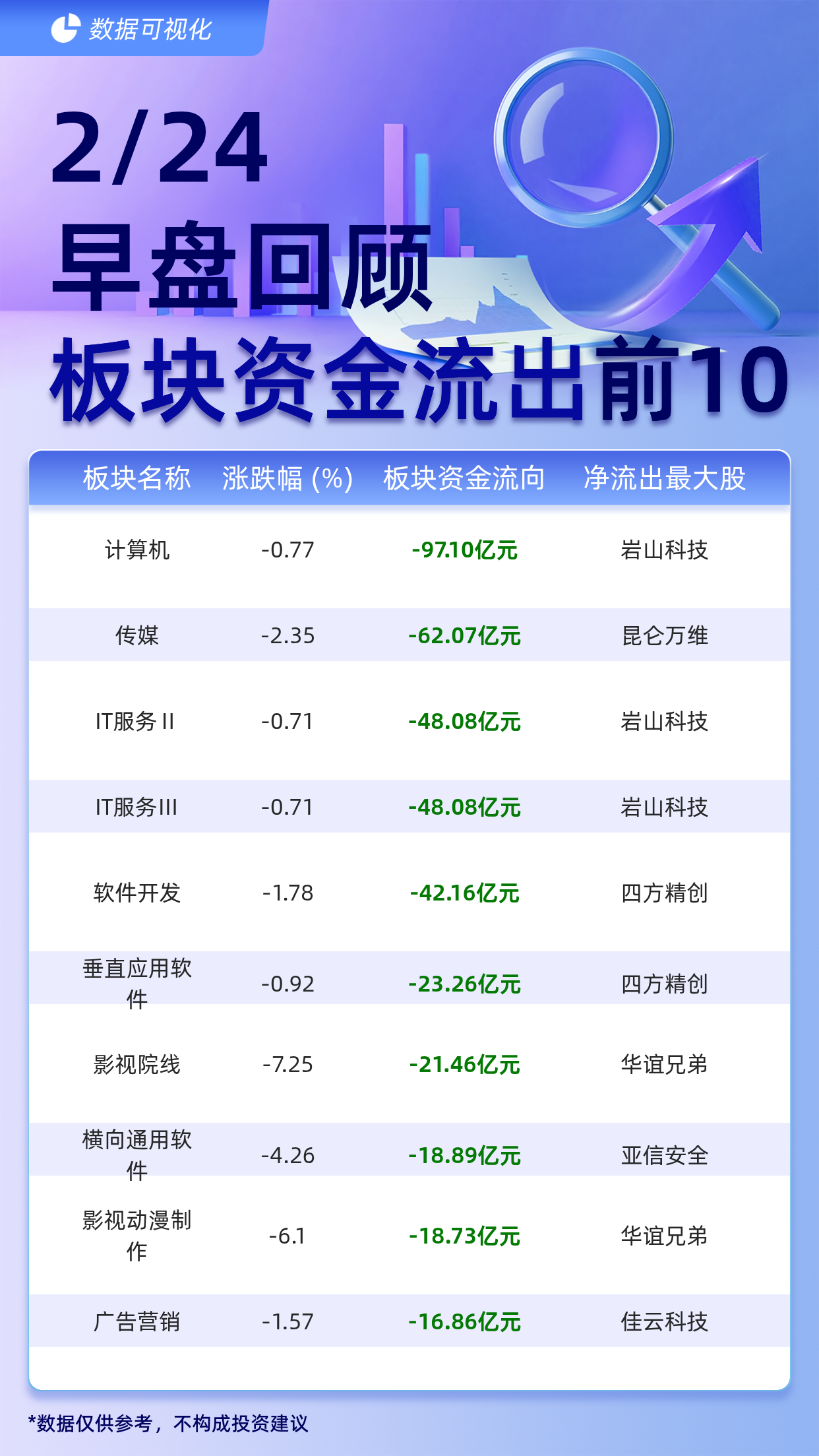 据交易所数据显示,截至2月24日午间收盘,大盘主力资金净流入122.98亿元。主力资金流出前十大板块分别为:计算机(-97.10亿元)、 传媒(-62.07亿 元)、IT服务Ⅱ(-48.08亿元)、IT服务Ⅲ(-48.08亿元)、 软件开发(-42.16亿元)、垂直 应用软件(-23.26亿元)、 影视院线(-21.46亿元)、横向通用 软件(-18.89亿元)、影视动漫制作(-18.73亿元)、 广告营销(-16.86亿元)。 | 影视院线 | -7.25 | -21.46亿元 | 华谊兄弟 | | --- | --- | --- | --- | | 横向通用软 件 | -4.26 | -18.89亿元 | 亚信安全 | | 影视动漫制 | -6.1 | -18.73亿元 | 华谊兄弟 | | 作 | | | | | 广告营销 | -1.57 | -16.86亿元 | 佳云科技 | | *数据仅供参考,不构成投资建议 | | | | | | 板块名称 涨跌幅(%) 板块资金流向 | | 净流出最大 | | --- | --- | --- | --- | | 计算机 | -0.77 | -97.10亿元 | ...
