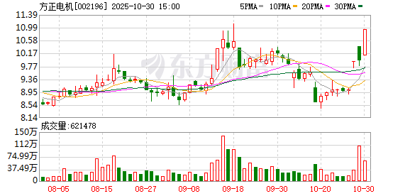 证券代码:002196 证券简称:方正电机 公告编号:2025-055 浙江方正电机股份有限公司 关于股票异动的公告 3、近期公共媒体未报道可能或已经对本公司股票交易价格产生较大影响的 未公开重大信息; 4、公司生产经营情况正常,内外经营环境未发生重大变化; 5、公司控股股东、持股 5%以上股东及其一致行动人在公司股票交易异常波 动期间未买卖本公司股票; 本公司及董事会全体人员保证公告内容真实、准确和完整,并对公 告中的虚假记载、误导性陈述或者重大遗漏承担责任。 一、股票交易异常波动情况 浙江方正电机股份有限公司(以下简称"公司")股票(证券简称:方正电 机,证券代码:002196)2025 年 10 月 28 日、2025 年 10 月 29 日、2025 年 10 月 30 日连续 3 个交易日收盘价格涨幅偏离值累计超过 20%,根据深圳证券交易 所的有关规定,属于股票交易异常波动的情况。 二、公司关注、核实情况说明 针对股票交易异常波动,公司对有关事项进行了核查,并问询了公司控股股 东,现将有关情况说明如下: 1、公司前期披露的信息不存在需要更正、补充之处; 2、经查询,公司、控股股东、持股 5%以上股 ...