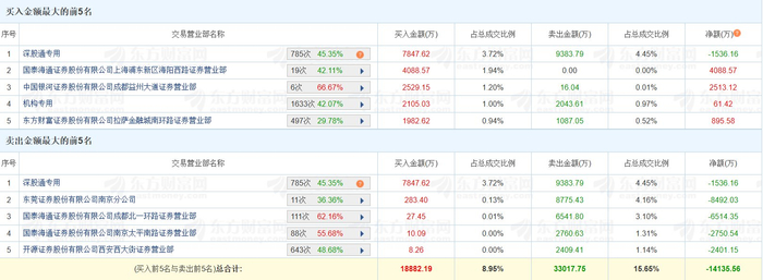 | 买入金额最大的前5名 | | | | | | | | | | --- | --- | --- | --- | --- | --- | --- | --- | --- | | ਖ਼ਿੰਦੇ | 交易营业部名称 | | | 英入金题(万) | 占总成交比例 | 共出会题(万) | 占总成交比例 | 净题(万)0 | | | 深般通专用 | 785次 45.35% | 0 | 7847.62 | 3.72% | 9383.79 | 1. 4.45% | -1536.16 | | 2 | 国泰等通证券股份有限公司上海硕东新区海阳西路运养营业部 | 197 42.11% | ▶ | 4088.57 | 1.94% | 0.00 | 0.00% | 4088 57 | | 3 | 中国银河证券股份有限公司成都益州大通证券营业部 | 6次 66.67% | > | 2529.15 | 1.20% | 16.04 | 0.01% | 2513.12 | | | 机构专用 | 1633次 42 07% | - | 2105.03 | 1.00% | 2043.61 | 0.97% | 61.42 | | રે | 东方财富 ...