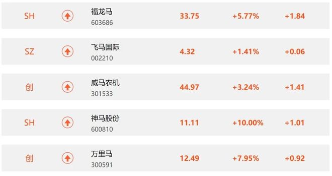 Group 1 - The "Ma" concept stocks experienced significant movement, with Shennma Co., Ltd. hitting the daily limit up, indicating strong investor interest [1] - Yema Battery saw an increase of over 8%, reflecting positive market sentiment towards companies associated with the "Ma" concept [1] - Other companies such as Fulongma, Wanlima, Feima International, and Weima Agricultural Machinery also showed upward trends, suggesting a broader rally in this sector [1]