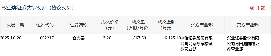 Core Insights - On October 28, Helitai conducted a block trade of 18.6753 million shares, with a transaction value of 61.2549 million yuan, accounting for 4.83% of the total trading volume for the day [1][2] - The transaction price was 3.28 yuan, which represents a discount of 2.38% compared to the market closing price of 3.36 yuan [1] Summary by Categories Trading Details - Transaction Date: October 28, 2025 [2] - Security Code: 002217 [2] - Security Name: Helitai [2] - Transaction Price: 3.28 yuan [2] - Transaction Volume: 18.6753 million shares [2] - Transaction Amount: 61.2549 million yuan [2] - Buyer Brokerage: CITIC Securities Co., Ltd. Beijing Hujialou Securities [2] - Seller Brokerage: Industrial Securities Co., Ltd. Putian Huayuan Road Securities [2]