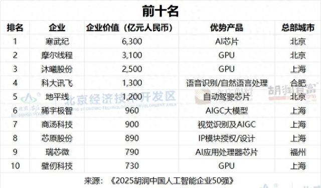 红星资本局1月19日消息,今日,胡润研究院发布《2025胡润中国人工智能企业50强》。 寒武纪(688256.SH)以6300亿元的企业价值位居榜首,比去年增长165%;"国产GPU第一股"摩尔线程(688795.SH)排 名第二,企业价值为3100亿元;沐曦股份(688802.SH)排名第三,企业价值为2500亿元;第四和第五名分别为科大讯飞 (002230.SZ)和地平线(09660.HK),企业价值分别为1300亿元和1200亿元。 | | | 前十名 | | | | --- | --- | --- | --- | --- | | 排名 | 企业 | 企业价值(亿元人民币) | 优势产品 | 总部城市 | | 1 | 寒武纪 | 6,300 | Al芯片 | 北京 | | 2 | 廖尔线程 | 3,100 | GPU | 北京 | | 3 | 沐曦股份 | 2,500 | GPU | 上海 | | র্ম | 科大讯飞 | 1,300 | 语音识别/自然语言处理 | 合肥 | | 5 -1 | | 地平线 言经济 1,200十万 区 | 自动驾驶芯片 | | | 6 JC & | | OL 960 | ...