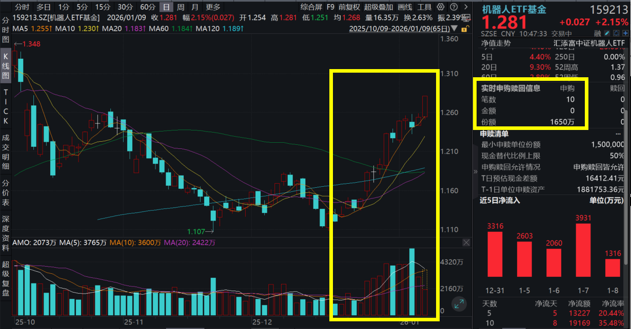 1月9日,A股市场震荡上行,沪指涨近1%,时隔10年重回4100点。截至10:50,机器人ETF基金(159213)涨超2%,资金持续涌入机器人板块,机器人ETF 基金(159213)盘中强势吸金2100万元,加上今日已连续9日强势吸金超2亿元! 【机器人ETF基金(159213)标的指数前十大成分股】 | 序号 | 代码 | 名称 | 申万一级行业 | 涨跌幅 | 估算极重 ▼ | | --- | --- | --- | --- | --- | --- | | 1 | 002230 | 科大讯飞 | 计算机 | 1.09% | 10.31% | | 2 | 300124 | 汇川技术 | 机械设备 | 1.43% | 9.98% | | 3 | 601689 | 拓普集团 | 汽车 | 2.17% | 7.60% | | 4 | 002236 | 大华股份 | 计算机 | 1.30% | 4.45% | | 5 | 002008 | 大族激光 | 机械设备 | 9.44% | 4.12% | | 6 | 688777 | 中控技术 | 机械设备 | 1.21% | 3.90% | | 7 | 688169 ...