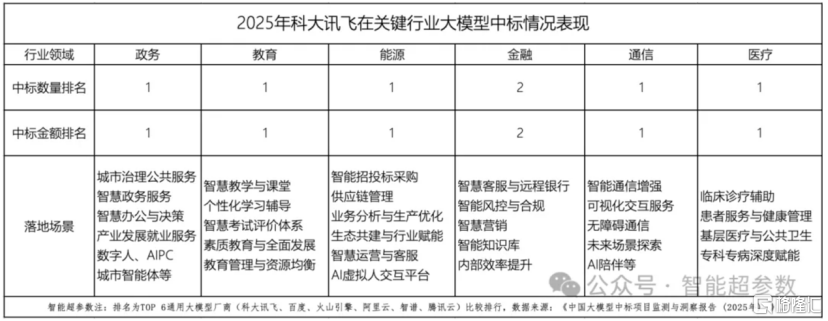 当前,数据安全与国产化替代已成为政企采购的核心标尺,尤其医疗科技领域的竞争逻辑也从单纯的技术比拼,转向 全栈能力与商业落地的综合较量。 智能超参数统计数据显示,2025年科大讯飞以210个大模型中标项目、23.16亿元中标金额,在TOP 6通用大模型厂商 中拿下第一。其中在医疗领域,讯飞医疗中标数量与金额均稳居赛道首位,成为科大讯飞在大模型赛道突围的核心增 长极。 | | | | 2025年科大讯飞在关键行业大模型中标情况表现 | | | | | --- | --- | --- | --- | --- | --- | --- | | 行业领域 | 政务 | 教育 | 能源 | 金融 | 通信 | 医疗 | | 中标数量排名 | | | | 2 | | | | 中标金额排名 | | | | 2 | | | | 落地场景 | 城市治理公共服务 产业发展就业服务 | 智慧教学与课堂 个性化学习辅导 | 智能招投标采购 | 智慧客服与远程银行 智能风控与合规 | 智能通信增强 可视化交互服务 | | | | 智慧政务服务 | | 供应链管理 | | | 临床诊疗辅助 | | | 智慧办公与决策 | | 业务分析与生产 ...