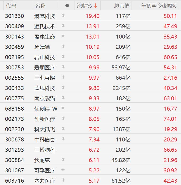 | 代码 | 名称 | | 涨幅% ↓ | 总市值 | 年初至今涨幅%。 | | --- | --- | --- | --- | --- | --- | | 301330 | 熵基科技 | 1 | 19.40 | 117亿 | 50.11 | | 300409 | 道氏技术 | 1 | 13.91 | 259亿 | 47.49 | | 300143 | 盈康生命 | -06- | 13.01 | 100亿 | 35.43 | | 300459 | 汤姆猫 | 1 | 10.19 | 209亿 | 29.63 | | 002195 | 岩山科技 | 1 | 10.05 | 646亿 | 60.65 | | 300753 | 爰朋医疗 | 1 | 9.99 | 53.97亿 | 54.31 | | 002555 | 三七互娱 | 4 | 9.97 | 664亿 | 27.16 | | 300433 | 蓝思科技 | 1 | 9.80 | 2245亿 | 40.34 | | 600775 | 南京熊猫 | 1 | 9.33 | 182亿 | 63.01 | | 688158 | 优刻得-W * | | 8.97 | ...