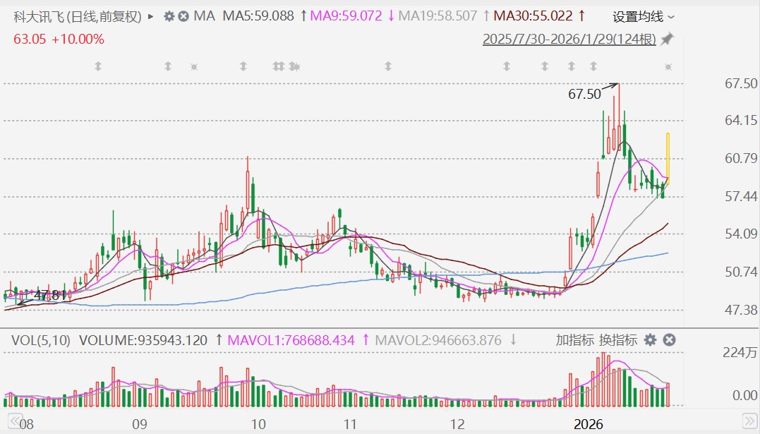 格隆汇1月29日|科大讯飞(002230.SZ)盘中拉升封涨停板,报价63.05元。消息面上,公司昨晚发布公告,预计2025年归属于上市公司股东的净利润为7.85 亿元-9.50亿元,比上年同期增长40%-70%。 业绩增长的背后,是科大讯飞大模型商业化的全面兑现。2025年,讯飞星火大模型相关项目中标金额达23.16亿元,在政务、教育、工业等领域的落地速 度和市场占有率持续领先。在To C端,星火大模型的赋能让AI学习机、智能办公本等消费产品持续热销,成为营业收入的重要抓手。在To B/G端,星火 大模型与各行业的深度融合,让公司在智慧城市、智慧医疗、智能制造等领域的订单量大幅提升,行业赋能的商业价值持续释放。 ...