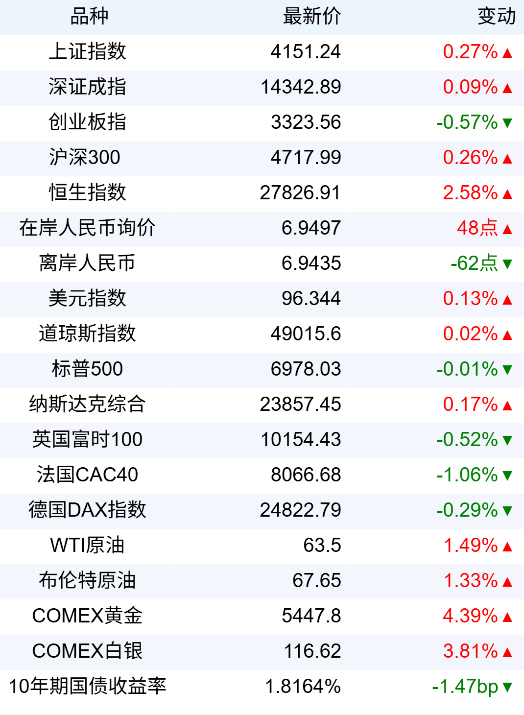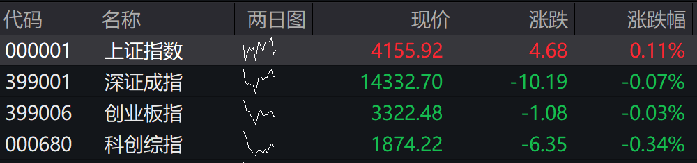 盘面上,贵金属板块持续走强,油气、基本金属板块再度上涨。AI应用、算力硬件、光伏、商业航天概念股回调。 沪指涨0.11%,深成指跌0.07%,创业板指跌0.03%。科创综指跌0.34%。 | 代码 | 名称 | 两日图 | 现价 | 涨跌 | 涨跌幅 | | --- | --- | --- | --- | --- | --- | | 000001 | 上证指数 | IMM | 4155.92 | 4.68 | 0.11% | | 399001 | 深证成指 | s | 14332.70 | -10.19 | -0.07% | | 399006 | 创业板指 | 1/2 | 3322.48 | -1.08 | -0.03% | | 000680 | 科创综指 | NN | 1874.22 | -6.35 | -0.34% | 盘面上,贵金属板块持续走强,四川黄金、湖南黄金、西部黄金等多股涨停;油气、基本金属板块再度上涨。AI应用、算力硬件、光伏、商业 航天概念股回调。 个股方面,科达制造复牌涨停,公司拟购买特福国际51.55%股份。 | | 16.26 +1.48 +10.01% | | | | 科达制造 1 ...