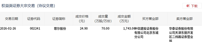 2月26日,歌尔股份大宗交易成交70万股,成交额1743万元,占当日总成交额的0.7%,成交价24.9元, 较市场收盘价27.08元折价8.05%。 | 权益类证券大宗交易(协议交易) | | | | | | | 团 下载 | | --- | --- | --- | --- | --- | --- | --- | --- | | 交易日期 | 证券代码 | 证券简称 | 成交价格 (元) | 成交量 (万股/万份) | 成交金额 (万元) | 买方营业部 | 卖方营业部 | | 2026-02-26 | 002241 | 歌尔股份 | 24.90 | 70.00 | | 1,743.00中信建投证券股份 | 华泰证券股份有限 | | | | | | | | 有限公司北京东城 | 公司天津东丽开发 | | | | | | | | 分公司 | 区二纬路证券营业 | | | | | | | | | तर | ...