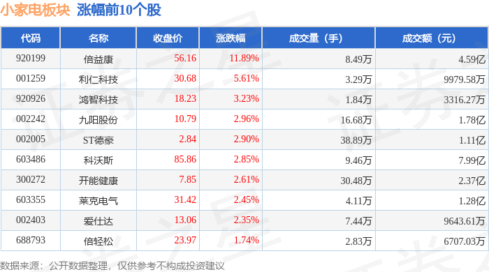 证券之星消息,12月30日小家电板块较上一交易日上涨0.6%,欧圣电气领涨。当日上证指数报收于 3965.12,下跌0.0%。深证成指报收于13604.07,上涨0.49%。小家电板块个股涨跌见下表: | 代码 | 名称 | 主力净流入(元) | 主力净占比 游资净流入 (元) | | 游资净占比 散户净流入(元) | | 散户净占比 | | --- | --- | --- | --- | --- | --- | --- | --- | | 002403 | 爰仕达 | 1655.36万 | 10.62% | 413.51万 | 2.65% | -2068.87万 | -13.28% | | 605555 德昌股份 | | 1567.84万 | 5.33% | 345.40万 | 1.17% | -1913.24万 | -6.50% | | 603486 | 科沃斯 | 1061.95万 | 2.09% | 666.90万 | 1.31% | -1728.84万 | -3.40% | | 603215 比依股份 | | 924.88万 | 9.07% | 520.09万 | 5.10% | -1444.97万 ...