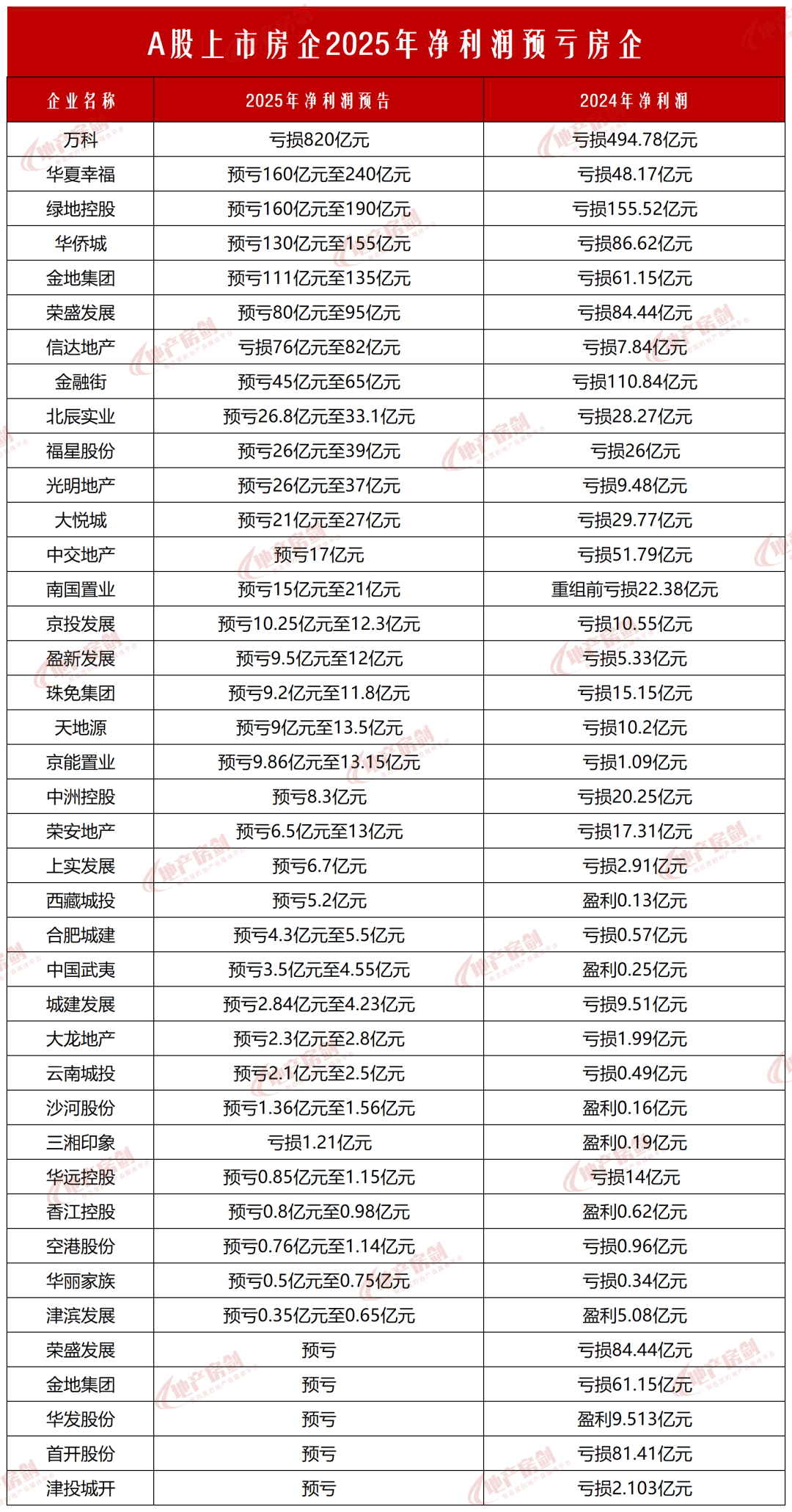 Core Viewpoint - The majority of A-share listed real estate companies are expected to report significant losses for the year 2025, indicating a challenging market environment for the industry [1][2]. Group 1: Loss Predictions - Out of 52 listed real estate companies, 40 are expected to report losses for 2025, which means over 80% of these companies are projected to be in the red [1]. - Five companies are expected to report losses exceeding 10 billion yuan, with Vanke leading at a projected loss of 820 billion yuan, followed by China Fortune Land Development, Greenland Holdings, Overseas Chinese Town, and Gemdale [2][3]. - Vanke's cumulative losses for 2024 and 2025 are projected to be nearly 1,315 billion yuan, surpassing the total profits from 2019 to 2023 [3]. Group 2: Reasons for Losses - The losses are attributed to declining property prices and significant impairment provisions that companies have had to make over the past two years [9][10]. - Many companies had previously anticipated a market recovery and began to recognize inventory impairments, but the continued market downturn has forced them to increase these provisions [10]. Group 3: Companies Reporting Profits - Twelve companies are expected to report profits, with Jinke Real Estate projected to achieve a net profit of 300 billion to 350 billion yuan, primarily due to successful restructuring [12][13]. - Poly Developments and China Merchants Shekou are also expected to report profits, albeit with significant declines compared to 2024, primarily due to impairment provisions [16][17]. Group 4: Market Dynamics - The list of loss-making companies includes a mix of private, state-owned, and central enterprises, indicating that the nature of the company does not correlate with the likelihood of losses [7]. - State-owned platform companies, which previously supported land acquisitions, are now facing increased pressure due to the ongoing market decline [8]. Group 5: Future Outlook - The upcoming annual report season in March and April 2025 will provide more detailed insights into the operational conditions of these companies [25].