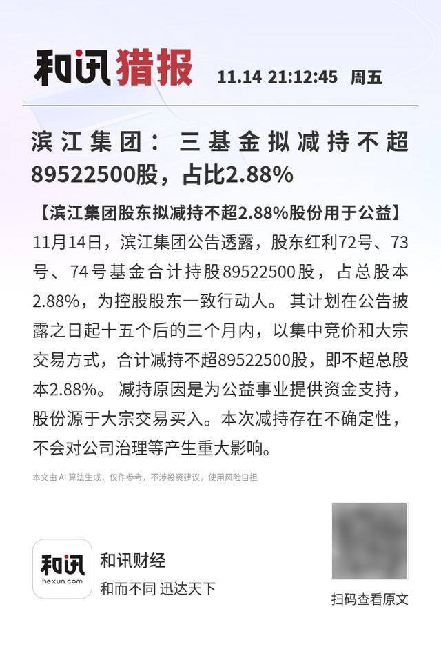 滨江集团:三基金拟减持不超89522500股,占比2.88%