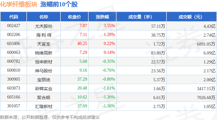 | 代码 | 名称 | 收盘价 | 涨跌幅 | 成交量(手) | 成交额(元) | | --- | --- | --- | --- | --- | --- | | 688722 | 同益中 | 20.66 | -5.01% | 9.11万 | 1.91亿 | | 002254 | 泰和新材 | 13.13 | -4.99% | 33.31万 | 4.43 Z | | 002998 | 优彩资源 | 8.49 | -4.50% | ● 16.68万 | 1.43亿 | | 688285 | 中复神鹰 | 33.84 | -4.11% | 10.25万 | 3.52亿 | | 603225 | 新凤鸣 | 21.28 | -3.49% | 14.21万 | 3.08亿 | | 600370 | 三房巷 | 2.66 | -2.92% | 53.94万 | 1.45亿 | | 000949 | 新乡化纤 | 7.05 | -2.76% | 86.13万 | 6.11亿 | | 000677 | 恒大海龙 | 4.47 | -2.61% | 27.65万 | 1.24亿 | | 002064 | 华峰化学 | 4 1 ...
