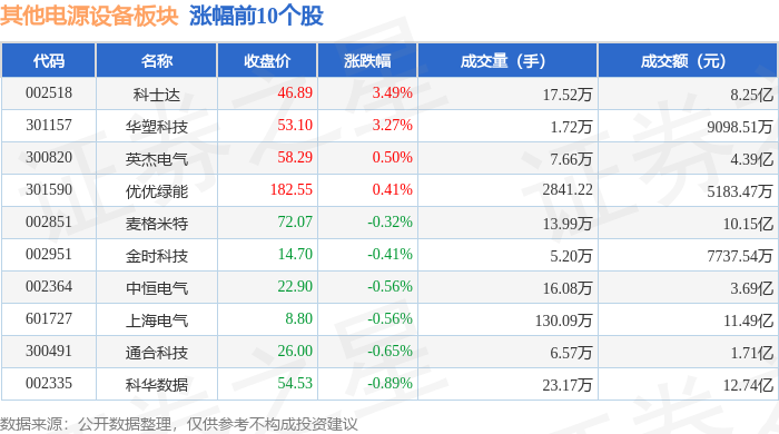 证券之星消息,11月18日其他电源设备板块较上一交易日下跌1.59%,海博思创领跌。当日上证指数报 收于3939.81,下跌0.81%。深证成指报收于13080.49,下跌0.92%。其他电源设备板块个股涨跌见下表: | 代码 | 名称 | 收盘价 | 涨跌幅 | 成交量(手) | 成交额(元) | | | --- | --- | --- | --- | --- | --- | --- | | 002518 | 科士达 | 46.89 | 3.49% | 17.52万 | | 8.25亿 | | 301157 | 华塑科技 | 53.10 | 3.27% | 1.72万 | | 9098.51万 | | 300820 | 英杰电气 | 58.29 | 0.50% | 7.66万 | | 4.39 乙 | | 301590 | 优优绿能 | 182.55 | 0.41% | 2841.22 | | 5183.47万 | | 002851 | 麦格米特 | 72.07 | -0.32% | 13.99万 | | 10.15 乙 | | 002951 | 金时科技 | 14.70 | -0.41% | 5.20万 ...