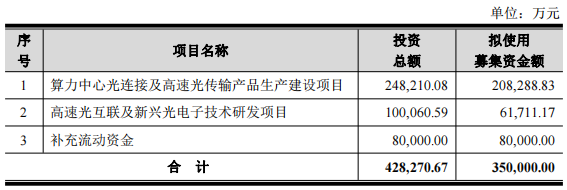 本次向特定对象发行股票募集资金总额预计不超过350,000万元(含350,000万元),在扣除发行费 用后实际募集资金净额将用于算力中心光连接及高速光传输产品生产建设项目、高速光互联及新兴光电 子技术研发项目、补充流动资金。 | 房号 | 项目名称 | 投资 总额 | 拟使用 事集资金额 | | --- | --- | --- | --- | | | 算力中心光连接及高速光传输产品生产建设项目 | 248,210.08 | 208,288.83 | | 2 | 高速光互联及新兴光电子技术研发项目 | 100,060.59 | 61,711.17 | | ਤੇ | 补充流动资金 | 80,000.00 | 80,000.00 | | | 合 计 | 428,270.67 | 350,000.00 | 中国经济网北京2月27日讯 光迅科技(002281.SZ)昨晚披露关于向特定对象发行股票申请获得深圳证 券交易所审核中心审核通过的公告称,公司于2026年2月26日收到深圳证券交易所出具的《关于武汉光 迅科技股份有限公司申请向特定对象发行股票的审核中心意见告知函》。深交所发行上市审核机构对公 司向特定对象发行股票的 ...