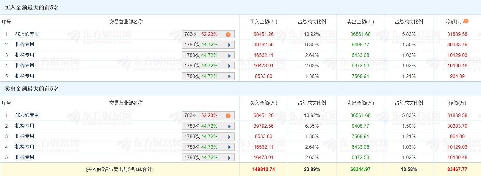 光迅科技(002281.SZ)今日涨停创历史新高,换手率10.83%,成交额62.71亿元。龙虎榜数据显示,深股通买入6.85亿元,卖出3.66亿元,净买入3.19亿元;四 家机构买入8.14亿元,卖出2.98亿元,净买入5.16亿元。上榜席位全天买入14.98亿元,卖出6.63亿元,合计净买入8.35亿元。(格隆汇) | 序号 | | 交易营业部名称 | | 买入金额(万) | 占总成交比例 | | --- | --- | --- | --- | --- | --- | | | 深股通专用 | | 783次 52.23% 2 | 68451.26 | 10.92% | | 2 | 机构专用 | | 1780次 44.72% | 39792.56 | 6.35% | | 3 | 机构专用 | | 1780次 44.72% | 8533.80 | 1.36% | | 4 | 机构专用 | | 1780次 44.72% | 16562.11 | 2.64% | | 5 | 机构专用 | | 1780次 44.72% | 16473.01 | 2.63% | | | | (买入前5名与卖出前5名)总合计: | | ...
