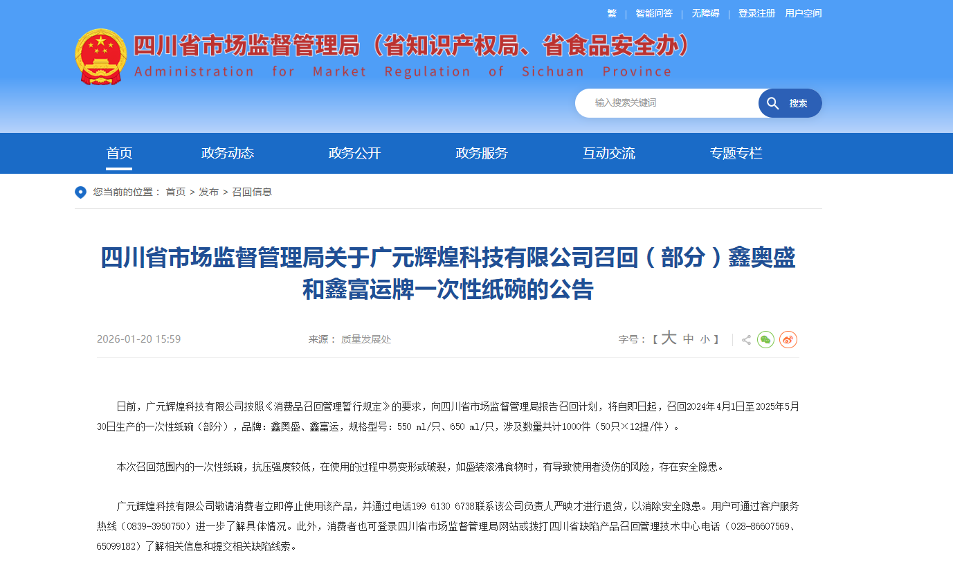 四川省市场监督管理局发布关于广元辉煌科技有限公司召回(部分)鑫奥盛和鑫富运牌一次性纸碗的公告