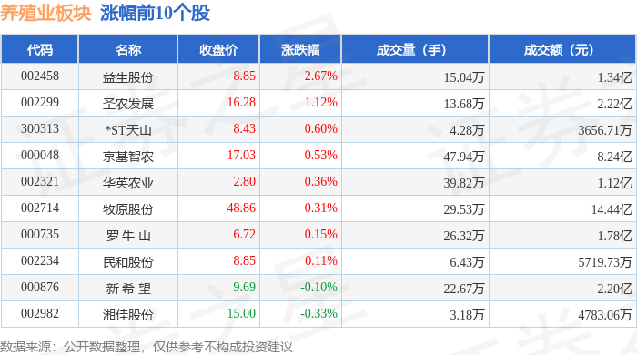 从资金流向上来看,当日养殖业板块主力资金净流出1.53亿元,游资资金净流入1.41亿元,散户资金净流 入1167.29万元。养殖业板块个股资金流向见下表: 证券之星消息,10月24日养殖业板块较上一交易日下跌0.08%,晓鸣股份领跌。当日上证指数报收于 3950.31,上涨0.71%。深证成指报收于13289.18,上涨2.02%。养殖业板块个股涨跌见下表: | 代码 | 名称 | 收盘价 | 涨跌幅 | 成交量(手) | 成交额(元) | | --- | --- | --- | --- | --- | --- | | 002458 | 益生股份 | 8.85 | 2.67% | 15.04万 | 1.34亿 | | 002299 | 圣农发展 | 16.28 | 1.12% | 13.68万 | 2.22亿 | | 300313 | *ST天山 | 8.43 | 0.60% | 4.28万 | 3656.71万 | | 000048 | 京基督农 | 17.03 | 0.53% | 47.94万 | 8.24亿 | | 002321 | 华英农业 | 2.80 | 0.36% | 39.82万 | 1.12 ...