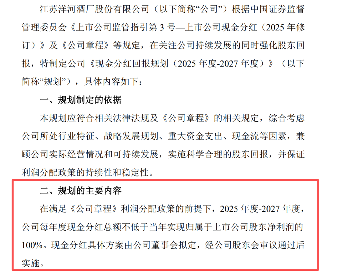 【导读】洋河股份公布现金分红回报规划(2025年度-2027年度) 中国基金报记者郑俊婷 1月23日晚间,洋河股份(证券代码:002304)连发3条重要公告,分别指向2025年业绩预告、现金分红回报规划、高管人事调整。 其中,现金分红回报规划尤为引人注目。洋河股份表示,在满足《公司章程》利润分配政策的前提下,2025年度-2027年度,公司每年度现金分红总额不 低于当年实现归母净利润的100%。 2025年第四季度减亏 根据业绩预告,洋河股份预计2025年实现归母净利润21.16亿元-25.24亿元,同比下降62.18%-68.30%。 | 项目 | 本报告期 | 上年同期 | | --- | --- | --- | | 归属于上市公司 股东的净利润 | 盈利: 211,578 万元-252,356 万元 | 盈利:667,338.86 万元 | | | 比上年同期下降:62.18%-68.30% | | | 扣除非经常性损 益后的净利润 | 盈利: 185,318 万元-226,096 万元 | 盈利:683,523.56 万元 | | | 比上年同期下降:66.92%-72.89% | | | 基本每股收 ...