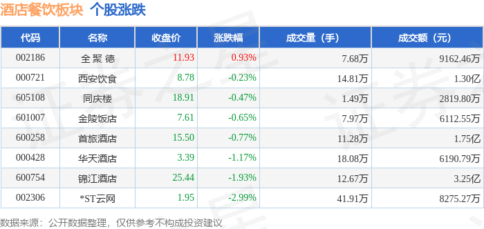 证券之星消息,11月25日酒店餐饮板块较上一交易日上涨0.72%,君亭酒店领涨。当日上证指数报收于 3870.02,上涨0.87%。深证成指报收于12777.31,上涨1.53%。酒店餐饮板块个股涨跌见下表: | 代码 | 名称 | 收盘价 | 涨跌幅 | 成交量(手) | 成交额(元) | | --- | --- | --- | --- | --- | --- | | 301073 | 君喜酒店 | 28.10 | 8.29% | 16.59万 | 4.59 Z | | 002186 | 全聚德 | 11.82 | 0.94% | 7.19万 | 8473.32万 | | 002306 | *ST云网 | 2.01 | 0.50% | 28.32万 | 5743.86万 | | 600754 | 锦江酒店 | 25.94 | 0.39% | 8.82万 | 2.28亿 | | 000721 | 西安饮食 | 8.80 | 0.34% | 13.25万 | 1.16亿 | | 601007 | 金陵饭店 | 7.66 | 0.26% | 6.54万 | 5012.76万 | | 605108 | 同庆楼 | ...