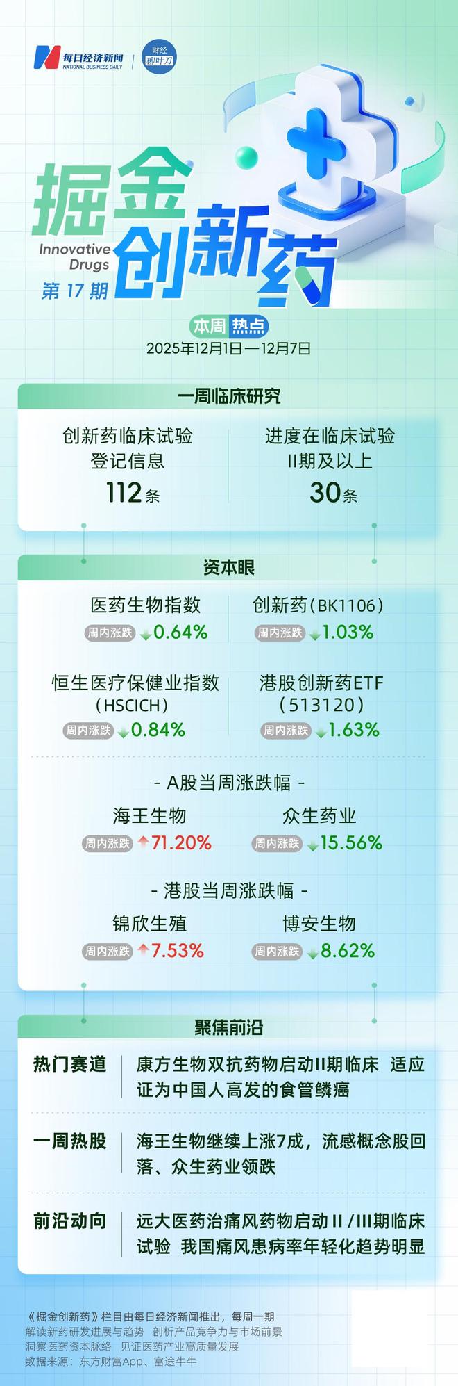 - A股当周涨跌幅 - 海王生物 众生药业 周内涨跌 ▲71.20% 周内涨跌 15.56% - 港股当周涨跌幅 - 锦欣生殖 博安生物 周内涨跌 ▲7.53% 周内涨跌 8.62% 聚焦前沿 热门塞道 康方生物双抗药物启动II期临床 适应 证为中国人高发的食管鳞癌 一周热股 海王生物继续上涨7成,流感概念股回 落、众生药业领跌 前沿动向 远大医药治痛风药物启动 II /III期临床 试验 我国痛风患病率年轻化趋势明显 《掘金创新药》栏目由每日经济新闻推出,每周一期 解读新药研发进展与趋势 剖析产品竞争力与市场前景 洞察医药资本脉络 见证医药产业高质量发展 数据来源:东方财富App、富途牛牛 资本服 一周行情 12月1日至12月5日,医药生物指数下跌0.64%,跑输上证指数1.34个百分点,结束两周上涨行情。创新 药(BK1106)周内下跌1.03%;恒生医疗保健业指数(HSCICH)周内下跌0.84%;港股创新药ETF (513120)周内下跌1.63%。 一周点评 上周相对表现最好的子板块是医药流通,创新药有医保目录发布预期,在上周五有所回暖。12月7日, 国家医保局发布了2025年《国家基本医疗保险、生 ...