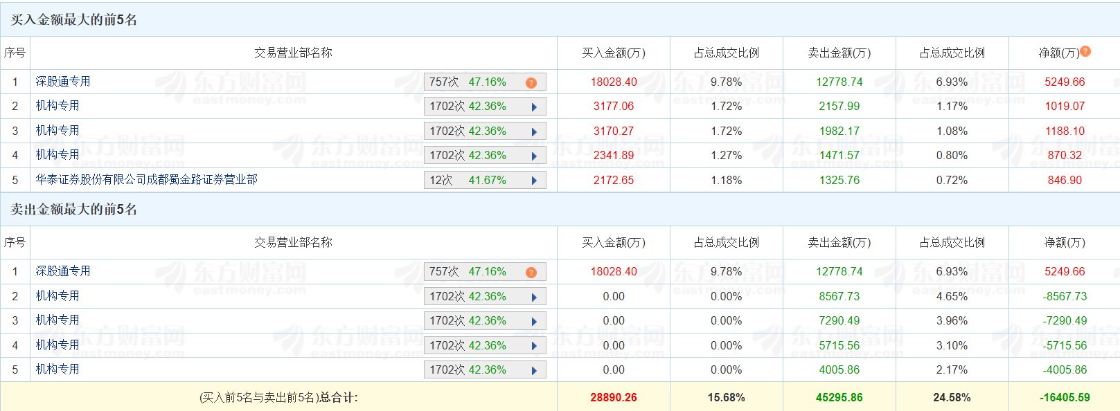 | | 休放題专用 | | 1511/ 41.16% | 18028.40 | 9.18% | | --- | --- | --- | --- | --- | --- | | 2 | 机构专用 | | 1702次 42.36% | 0.00 | 0.00% | | 3 | 机构专用 | | 1702次 42.36% | 0.00 | 0.00% | | | 机构专用 | | 1702次 42.36% | 0.00 | 0.00% | | 5 | 机构专用 | | 1702次 42.36% | 0.00 | 0.00% | | | | 十分运行名与表于非上名后后人时 | | 28890 26 | 15 68% | | | 买入金额最大的前5名 | | | | | | | --- | --- | --- | --- | --- | --- | --- | | 序号 | | 交易营业部名称 | | | 买入金额(万) | 占总成交比例 | | 1 | 深股通专用 | | 757次 47.16% | 2 | 18028.40 | 9.78% | | 2 | 机构专用 | | 1702次 42.36% | ▲ | 31 ...