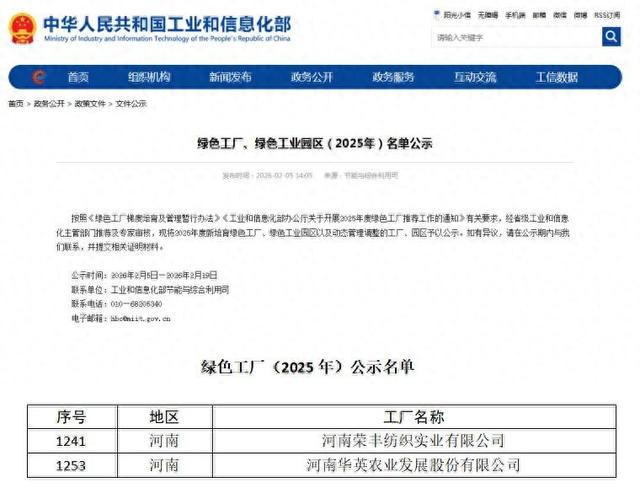 来源:环球网 | | P houl apparent | manier's and 1 . 1 . | | --- | --- | --- | | 1241 | 河南 | 河南荣丰纺织实业有限公司 | | 1253 | 河南 | 河南华英农业发展股份有限公司 | 日前,工业和信息化部公示2025年度国家级绿色工厂名单。河南荣丰纺织实业有限公司(纺织重点行 业)与河南华英农业发展股份有限公司(农业产业化龙头企业)成功入选,河南省信阳市潢川县再添国 家级绿色制造标杆。 作为县域纺织行业标杆,河南荣丰纺织以6000吨纺纱、10000万米织布年产能为基础,在绿色低碳领域 表现突出。其单位可比产品综合能耗仅0.69kgce/m,远优于行业先进值,5.724MW伏发电项目年供电近 6000兆瓦,占企业用电17%。公司通过GRS、GOTS双认证,参与3项绿色低碳标准制定,资源利用效率 与绿色产品实力居行业前列。 农业产业化龙头企业河南华英农业则构建了全链条绿色生产模式。2024年其可再生资源占比达 30.66%,肉类加工单位产品能耗达到行业先进水平。公司近三年累计投入1312.63万元用于绿色低碳改 造,污染物排放浓度远低 ...