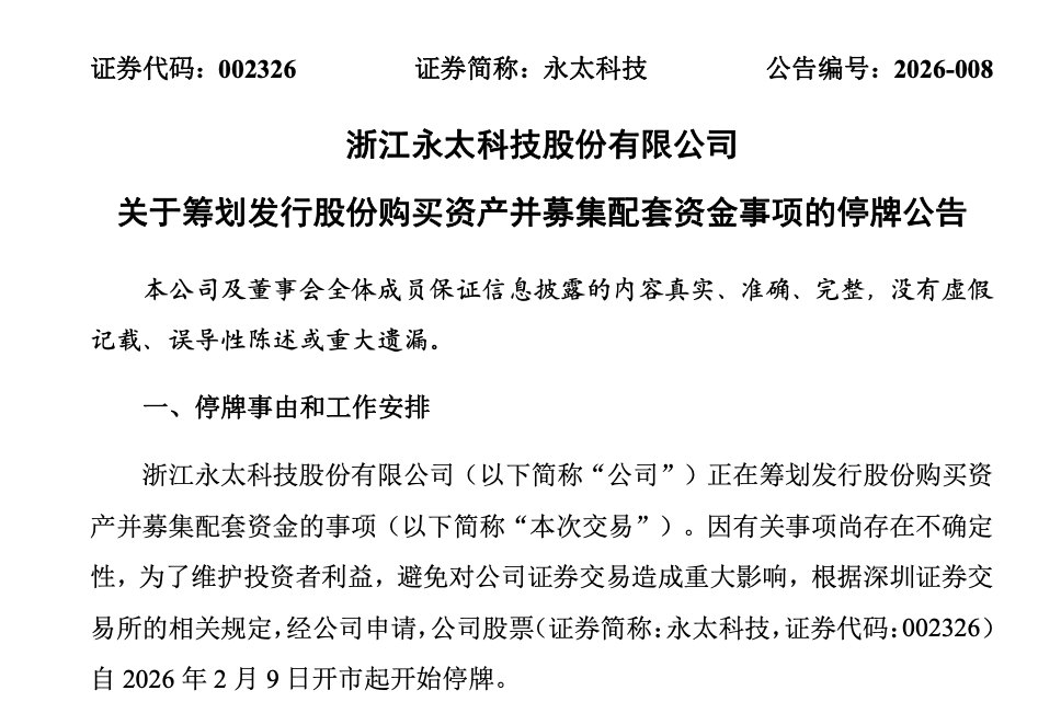 2月8日晚间,多家公司发布涉及并购重组、实控人变更等重要公告,其中两股已提前涨停。 永太科技(002326.SZ)公告,公司拟以发行股份方式购买宁德时代持有的永太高新(标的公司)25%股权并募集配套资金,公司现持有该标的公司75%股 权。本次交易完成后,宁德时代将成为公司股东。公司股票自2月9日开市起停牌。 业绩方面,永太科技预计2025年实现营业收入50亿元至55亿元;归母净利润虽然仍为负值(亏损2560万元至4860万元),但相比上年同期4.78亿元的亏损, 减亏幅度超过90%。 同样提前涨停的还有杉杉股份。 据公告,永太科技预计在不超过10个交易日的时间内披露本次交易方案,即在3月3日前披露相关信息。若公司未能在上述期限内召开董事会审议并披露交易 方案,公司证券最晚将于3月3日开市起复牌并终止筹划相关事项。 宁德时代入股永太高新已超4年。资料显示,2022年1月12日,永太高新的股东新增宁德时代,持股比例为25%。 值得注意的是,该股已提前涨停。2月6日午后,永太科技的股价大幅拉至涨停,最新市值为266亿元。这也是该股2026年以来首个涨停板。 业绩方面,杉杉股份公告称,预计2025年的归母净利润为4亿 ...