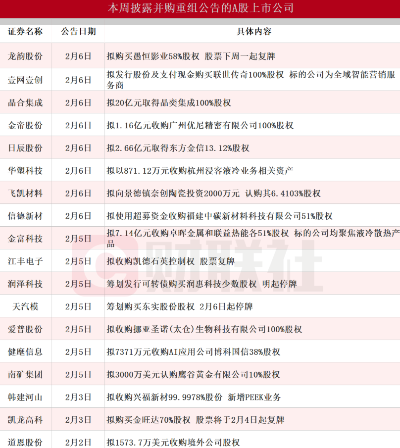 视频丨陈泽锴 据公告,永太科技预计在不超过10个交易日的时间内披露本次交易方案,即在3月3日前披露相关信息。若公司未能 在上述期限内召开董事会审议并披露交易方案,公司证券最晚将于3月3日开市起复牌并终止筹划相关事项。 2月8日晚间,多家公司发布涉及并购重组、实控人变更等重要公告,其中两股已提前涨停。 并购火热,两股明天停牌 A股锂电板块将迎来一起重要资本运作。 值得注意的是,该股已提前涨停。2月6日午后,永太科技的股价大幅拉至涨停,最新市值为266亿元。这也是该股 2026年以来首个涨停板。 同在2月8日晚间,国内商用车主动安全系统龙头瑞立科密(001285)公告,公司正在筹划发行股份购买控股子公司 武汉科德斯剩余16%股权。本次交易完成后,武汉科德斯将成为公司的全资子公司。公司股票自2026年2月9日起停 牌。 A股并购重组持续火热。据智通财经不完全统计,本周至少18家公司披露并购重组进展。 | | | 本周披露并购重组公告的A股上市公司 | | --- | --- | --- | | 证券名称 | 公告目期 | 具体内容 | | 龙韵股份 | 2月6日 | 拟购买悬恒影业58%股权 股票下周一起复牌 | ...