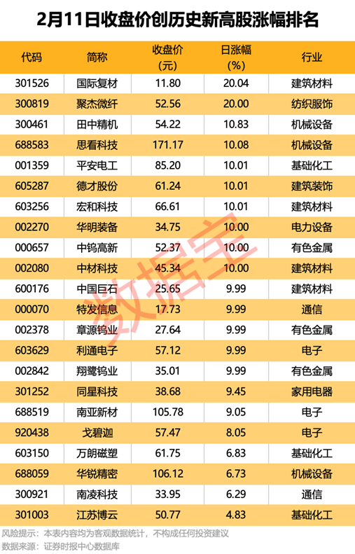 今日(2月11日)A股三大指数涨跌不一,上证指数收于4131.99点,上涨0.09%;深证成指跌0.35%,创 业板指跌1.08%。市场全天成交额约2万亿元,较前一交易日缩量1237亿元,收盘上涨个股超2000只, 其中60股涨停。 盘面上,小金属概念领涨,板块内东方钽业、中钨高新、章源钨业等多股涨停。能源金属、油气开采及 服务、化学纤维等概念跟涨。影视院线、短剧游戏、文化传媒等概念跌幅居前。 51股收盘价创历史新高 据证券时报·数据宝统计,不含近一年上市的次新股,今日共有51股收盘价创历史新高。从行业属性来 看,机械设备、电子、基础化工行业创新高的个股较为集中,分别有10股、9股、7股出现在名单中。 收盘价创历史新高股今日股价平均上涨5.43%,其中涨停的有国际复材、聚杰微纤、宏和科技等,涨幅 居前的有田中精机、思看科技、同星科技等。 | 代码 | 简称 | 收盘价 | 日涨幅 | 行业 | | --- | --- | --- | --- | --- | | | | (元) | (%) | | | 301526 | 国际复材 | 11.80 | 20.04 | 建筑材料 | | 300819 | 聚杰微纤 ...