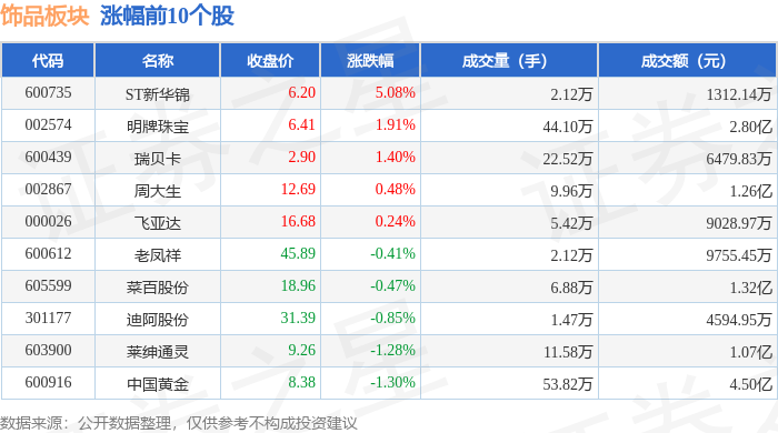 从资金流向上来看,当日饰品板块主力资金净流出1.96亿元,游资资金净流入5528.18万元,散户资金净 流入1.41亿元。饰品板块个股资金流向见下表: | 代码 | 名称 | 主力净流入(元) | 主力净占比 游资净流入 (元) | | 游资净占比 散户净流入(元) | | 散户净占比 | | --- | --- | --- | --- | --- | --- | --- | --- | | 600439 | 瑞贝卡 | 676.25万 | 10.44% | -159.87万 | -2.47% | -516.39万 | -7.97% | | 600735 | ST新华锦 | 510.29万 | 38.89% | -288.11万 | -21.96% | -222.18万 | -16.93% | | 301177 迪阿股份 | | 18.39万 | 0.40% | -265.09万 | -5.77% | 246.70万 | 5.37% | | 000026 | 飞亚达 | -711.18万 | -7.88% | 470.85万 | 5.21% | 240.33万 | 2.66% | | 605599 菜百股份 ...