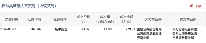 1月13日,柘中股份大宗交易成交11.98万股,成交额279.37万元,占当日总成交额的1.62%,成交价 23.32元,较市场收盘价20.86元溢价11.79%。 | 交易日期 | 证券代码 | 证券简称 | 成交价格 | 成交量 | 成交金额 | 买方营业部 | 卖方营业部 | | --- | --- | --- | --- | --- | --- | --- | --- | | | | | (元) | (万股/万份) | (万元) | | | | 2026-01-13 | 002346 | 柘中股份 | 23.32 | 11.98 | | 279.37 国信证券股份有限 | 申万宏源证券有限 | | | | | | | | 公司南京洪武路证 | 公司上海静安区海 | | | | | | | | 劳营业部 | 宁路证券营业部 | ...