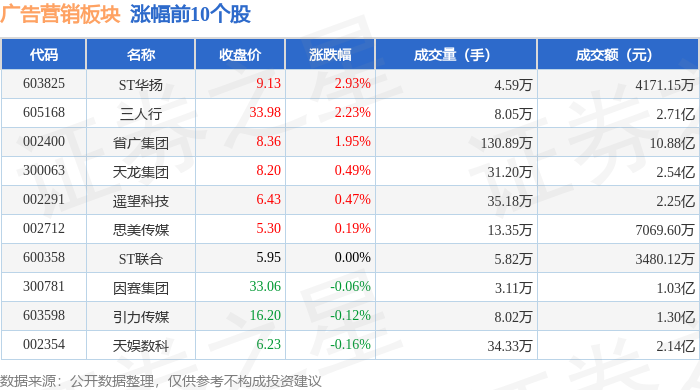 证券之星消息,12月26日广告营销板块较上一交易日下跌0.53%,新 华 都领跌。当日上证指数报收于 3963.68,上涨0.1%。深证成指报收于13603.89,上涨0.54%。广告营销板块个股涨跌见下表: | 代码 | 名称 | 收盘价 | 涨跌幅 | 成交量(手) | 成交额(元) | | | --- | --- | --- | --- | --- | --- | --- | | 603825 | ST华历 | 9.13 | 2.93% | 4.59万 | | 4171.15万 | | 605168 | 三人行 | 33.98 | 2.23% | 8.05万 | | 2.71亿 | | 002400 | 省广集团 | 8.36 | 1.95% | 130.89万 | | 10.88亿 | | 300063 | 天龙集团 | 8.20 | 0.49% | - 31.20万 | | 2.54亿 | | 002291 | 遥望科技 | 6.43 | 0.47% | 35.18万 | | 2.25亿 | | 002712 | 思美传媒 | 5.30 | 0.19% | 13.35万 | | 7069.60万 | ...