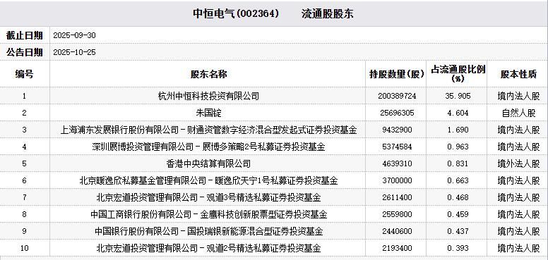 | | 中恒电气(002364) 流通股股东 | | | | | --- | --- | --- | --- | --- | | 截止日期 | 2025-09-30 | | | | | 公告日期 | 2025-10-25 | | | | | 编号 | 股东名称 | 持股数里(股) | 占流通股比例 (%) | 股本性质 | | | 杭州中恒科技投资有限公司 | 200389724 | 35. 905 | 境内法人股 | | 2 | 未国锭 | 25696305 | 4.604 | 自然人股 | | 3 | 上海浦东发展银行股份有限公司-财通资管数字经济混合型发起式证券投资基金 | 9432900 | 1.690 | 境内法人股 | | র্ব | 深圳展博投资管理有限公司-展博多策略2号私募证券投资基金 | 5374584 | 0. 963 | 境内法人股 | | 5 | 香港中央结算有限公司 | 4639310 | 0.831 | 境外法人股 | | ଚ | 北京暖逸欣私募基金管理有限公司 - 暖逸欣天宁1号私募证券投资基金 | 3700000 | 0. 663 | 境内法人股 | | 7 | 北京宏道投资 ...