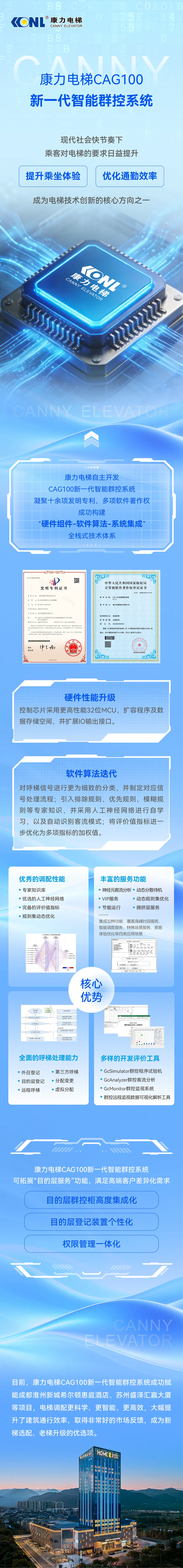 ® 康力电梯 KONI CANNY ELEVATOR 康力电梯CAG100 一代智能群控系统 HT- 现代社会快节奏下 乘客对电梯的要求日益提升 提升乘坐体验 控制芯片采用更高性能32位MCU, 扩容程序及数 据存储空间,并扩展IO输出接口。 软件算法选代 优化通勤效率 成为电梯技术创新的核心方向之一 B8 C ANINY ELEVAD 康力电梯自主开发 CAG100新一代智能群控系统 凝聚十余项发明专利、多项软件著作权 成功构建 "硬件组件-软件算法-系统集成" 硬件性能升级 对呼梯信号进行更为细致的分类,并制定对应信 全栈词能 号处埋流桂;5|人强陈规则、优元规则、嗅糊规 则等专家知识,并采用人工神经网络进行自学 习,以及自动识别客流模式;将评价值指标进一 步优化为多项指标的加权值。 丰富的服务功能 优秀的调配性能 · 专家知识库 · 神经元客流分析 · 动态分散待机 · 优选的人工神经网络 · 动态规则集优化 · VIP服务 · 完备的评价值指标 · 节能运行 · · 拥挤层服务 · 规则集动态优化 集成32种功能,覆盖高峰时段服务、 智能调度服务、特殊场景服务、乘客 体验优化等四类应用场景 全面的呼梯 ...