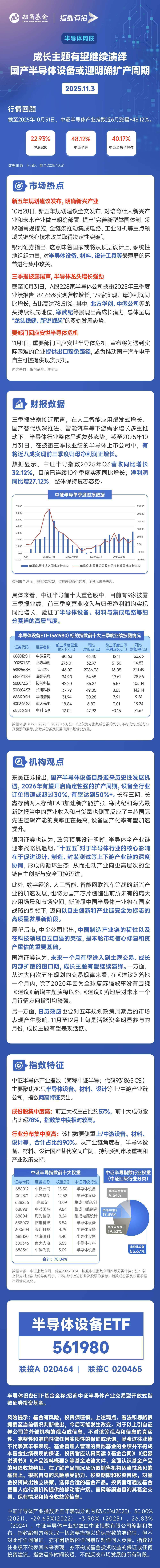 进入11月,沪指在突破十年高点4000点后回调震荡,科创50等成长指数表现低迷,前期热度居高的AI、半导体等硬科技板块有所承压。截至11 月3日,半导体设备ETF(561980)连续调整三日,但资金面保持净流入,最近4个交易日累计获得1.26亿净申购。 据了解,该ETF跟踪中证半导体产业指数,成份股聚焦芯片产业链中/上游,对国产替代攻坚领域的半导体设备、材料与集成电路设计,三大 行业集中度高达90%。近期资金持续逆势布局半导体设备ETF(561980),显示市场或依旧看好新阶段科技自立自强主线。 对于近期成长板块的调整,中信建投指出,10月下旬市场情绪高涨、三大利好(规划出台、谈判进展和季报披露)集中兑现后,A股已经处于 较高位置,且后续面临利好空窗期,市场可能面临新一轮横盘调整,主线和风格也可能出现切换。基金三季报显示电子行业配置比例超过 25%,双创板块超过40%,成长风格超过60%,均为2010年以来最高水平,或可能引发结构性调整。 基本面上,目前三季报披露接近尾声,在人工智能应用爆发式增长、国产替代纵深推进、智能汽车等下游需求增长多重推动下,半导体行业整 体呈现复苏态势。数据显示,中证半导指数2025 ...