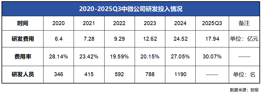 文 | 财经思享汇,作者 | 刘亚杰,编辑 | 管东生 同样是半导体设备商的定位,中微公司(688012.SH)和北方华创(002371.SZ)之间差距有些明显。尤其在追赶者有概 念支撑和能力优势的时候,后来居上的野心是藏不住的。 中微公司肯定是那个后来者:结合财报信息,在逻辑集成电路制造环节,中微公司开发的12英寸高端刻蚀设备,已运行 在国际知名客户最先进的生产线上,在5nm及以下高精度器件加工过程中发挥重要作用;截至2025年上半年,14项在研 项目中有9项框定为"国际先进水平"。 为巩固技术优势,加大研发投入成为普遍选择,中微公司更为决绝,自2020年以来,研发费用已经从6.4亿元涨至2024年 的24.52亿元,CAGR(Compound Annual Growth Rate,年复合增长率)达到39.91%。值得一提的是,截至2025年三季 度,其1190名研发人员数量以及30.07%研发费用率,均达到近期最高点。 被忽略的鸿沟 其实将中微公司与北方华创对比并不很合适。 | | | | 2020-2025Q3中微公司研发投入情况 | | | | | | --- | --- | --- | --- | ...