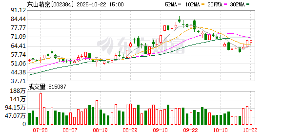 Core Viewpoint - Dongshan Precision has shown significant stock performance with a year-to-date increase of 139.48%, despite recent fluctuations in trading volume and price [1][2]. Group 1: Stock Performance - As of October 22, Dongshan Precision's stock price reached 69.76 CNY per share, with a trading volume of 17.85 billion CNY and a market capitalization of 127.77 billion CNY [1]. - The stock has experienced a 2.09% increase during the trading session on October 22, with a net inflow of 1.21 billion CNY from main funds [1]. - Year-to-date, the stock has risen by 139.48%, with a recent 11.60% increase over the last five trading days, but a 12.48% decrease over the last 20 days [1]. Group 2: Financial Performance - For the period from January to September 2025, Dongshan Precision reported a revenue of 27.07 billion CNY, reflecting a year-on-year growth of 2.28%, and a net profit attributable to shareholders of 1.22 billion CNY, which is a 14.61% increase year-on-year [2]. - The company has distributed a total of 1.54 billion CNY in dividends since its A-share listing, with 731 million CNY distributed over the past three years [2]. Group 3: Shareholder Information - As of September 30, 2025, the largest circulating shareholder is Hong Kong Central Clearing Limited, holding 68.71 million shares, an increase of 5.25 million shares from the previous period [3]. - New institutional shareholders include Ruiyuan Growth Value Mixed A and Xingquan Helun Mixed A, holding 21.34 million shares and 11.78 million shares, respectively [3].