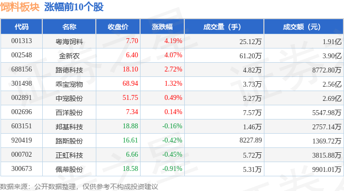 | 代码 | 名称 | 收盘价 | 涨跌幅 | 成交量(手) | 成交额(元) | | --- | --- | --- | --- | --- | --- | | 603363 | 傲农生物 | 4.23 | -4.08% | 82.90万 | 3.56亿 | | 002548 | 金新农 | 6.15 | -3.91% | 42.22万 | 2.62亿 | | 300673 | 佩蒂股份 | 18.75 | -2.09% | 0 6.49万 | 1.22亿 | | 002696 | 百洋股份 | 7.33 | -1.74% | 9.46万 | 6938.37万 | | 002891 | 中宠股份 | 51.50 | -1.38% | 4.48万 | 2.31亿 | | 920419 | 路斯股份 | 16.68 | -1.24% | 1.50万 | 2525.55万 | | 000702 | 正虹科技 | 6.69 | -0.89% | 3.79万 | 2540.84万 | | 301498 | 乖宝宠物 | 68.04 | -0.67% | 3.13万 | 2.12亿 | | 002567 | 唐人神 | ...