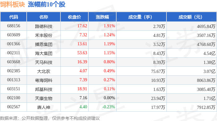 证券之星消息,1月16日饲料板块较上一交易日下跌0.52%,傲农生物领跌。当日上证指数报收于 4101.91,下跌0.26%。深证成指报收于14281.08,下跌0.18%。饲料板块个股涨跌见下表: | 代码 | 名称 | 收盘价 | 涨跌幅 | 成交量(手) | 成交额(元) | | --- | --- | --- | --- | --- | --- | | 603363 | 傲农生物 | - 4.16 | -1.65% | 62.38万 | 2.61亿 | | 002100 | 天康生物 | 7.07 | -1.26% | 24.74万 | 1.76亿 | | 603609 | 禾丰股份 | 7.23 | -1.23% | 4.25万 | 3091.93万 | | 002311 | 海大集团 | 53.00 | -1.17% | 8.00万 | 4.29亿 | | 001366 | 播恩集团 | 13.47 | -1.03% | 3.34万 | 4504.72万 | | 002385 | 大北农 | 4.03 | -0.98% | 68.93万 | 2.79亿 | | 603668 | 天马科技 | 16 ...